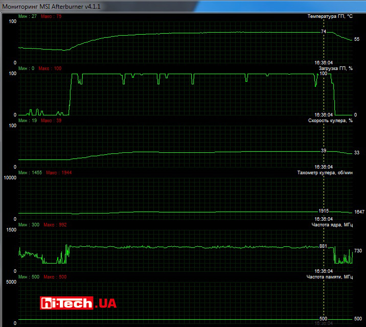 Со своей работой система охлаждения справляется хорошо. Под нагрузкой температура GPU повышается до отметки 74 °С, что вполне нормально, и при этом видеокарту совсем не назовешь шумной.