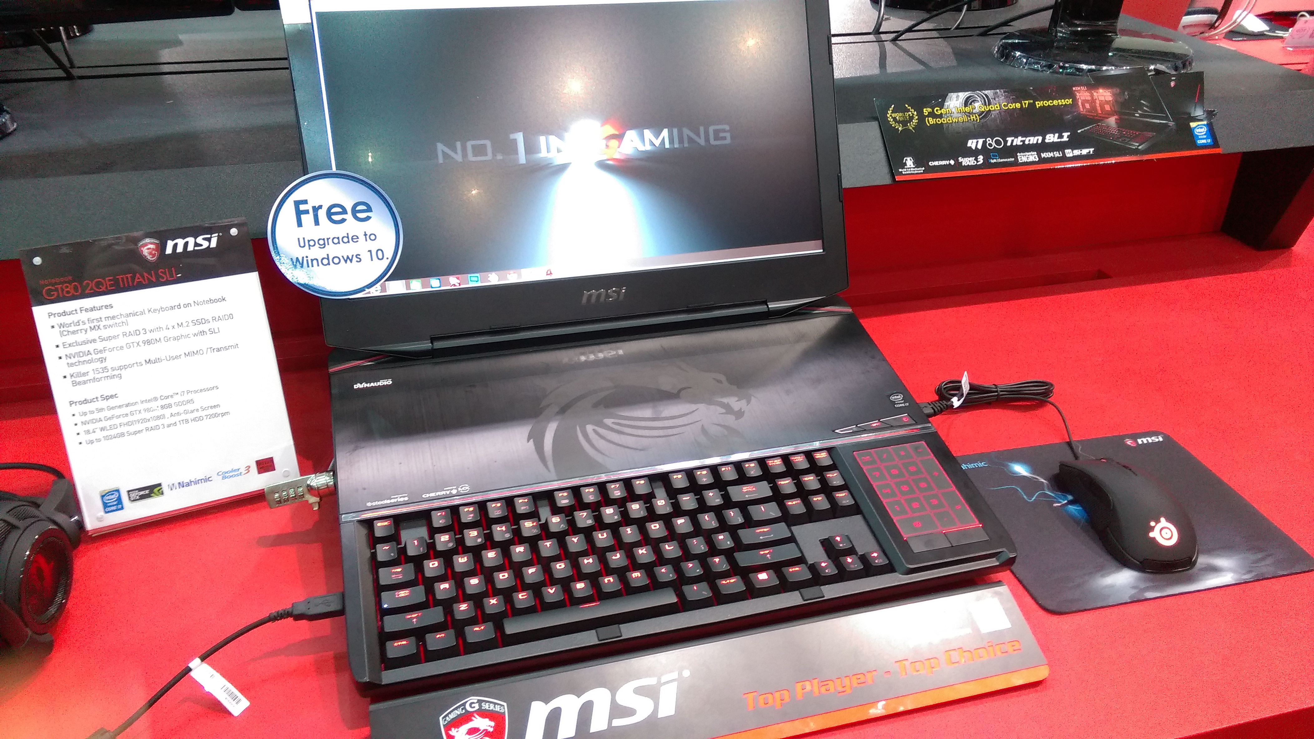 Были на стенде, разумеется, и ноутбуки. MSI предлагает широкий выбор как в плане характеристик, так и цен — от $1500 до $3000. Наше внимание в первую очередь привлек первый в мире лэптоп с механической клавиатурой MSI GT80 2QE Titan SLI. Выглядит он довольно необычно, а механическая клавиатура по началу и вовсе сбивает с толку. Внутри устройства процессор Intel Core i7-4980HQ 2,8 ГГц, две видеокарты GeForce 980M в режиме SLI дающие 8 ГБ GDDR5 видеопамяти и 32 ГБ памяти оперативной. Диагональ дисплея 18,4 дюйма (Full HD). Также были представлены и другие модели.