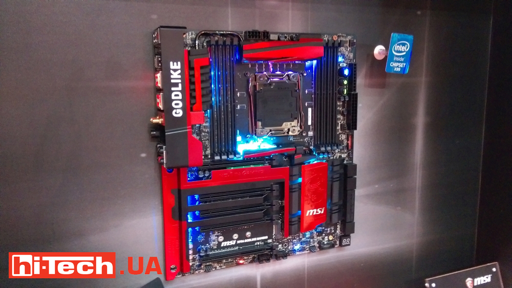 Компания MSI продемонстрировала множество видеокарт и материнских плат. Например, материнские платы на чипсете Intel X99 Express для процессоров Haswell-E в исполнении LGA 2011-3. На стенде были разные модели. Самые продвинутые из них поддерживают до 128 ГБ DDR4 ОЗУ и установку до 4 видеокарт.
