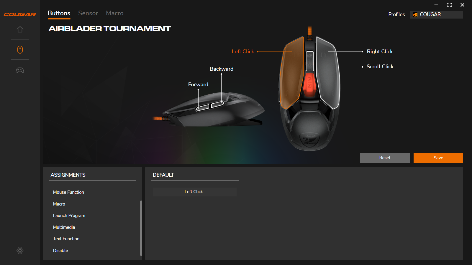 Настройку кнопок и сенсора можно осуществить в новом фирменном приложении – Cougar PIX. Для этой мыши в ней всего три вкладки – переназначение основных клавиш, параметры сенсора и инструмент записи макросов.