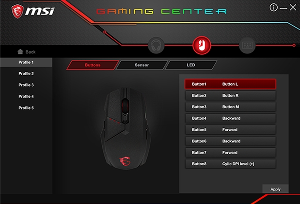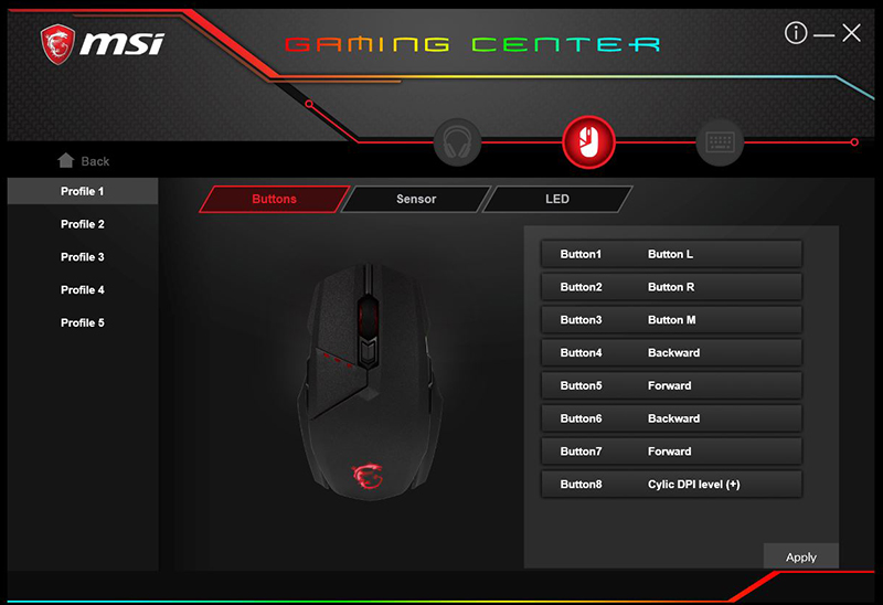 В мышке установлен сенсор PixArt 3330, его максимальное разрешение — 7200 DPI. Этот показатель можно программно увеличить в утилите MSI Gaming Center, в которой также есть настройка кнопок, макросов, подсветки и т. д.