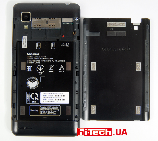Под крышкой также находятся слоты для двух полноразмерных SIM-карт и слот для карты памяти microSD. Заявлено о поддержке карт до 64 ГБ, хотя нам это проверить не удалось. Вероятно на случай зависания аппарата, предусмотрена потайная красная кнопка сброса в углублении слота карты памяти. Интересно, что крышка закрывает не всю заднюю сторону. Сверху и снизу остаются пластиковые полоски. На верхней размещена основная 8-мегапиксельная камера со вспышкой, а на нижней — решетка динамика.
