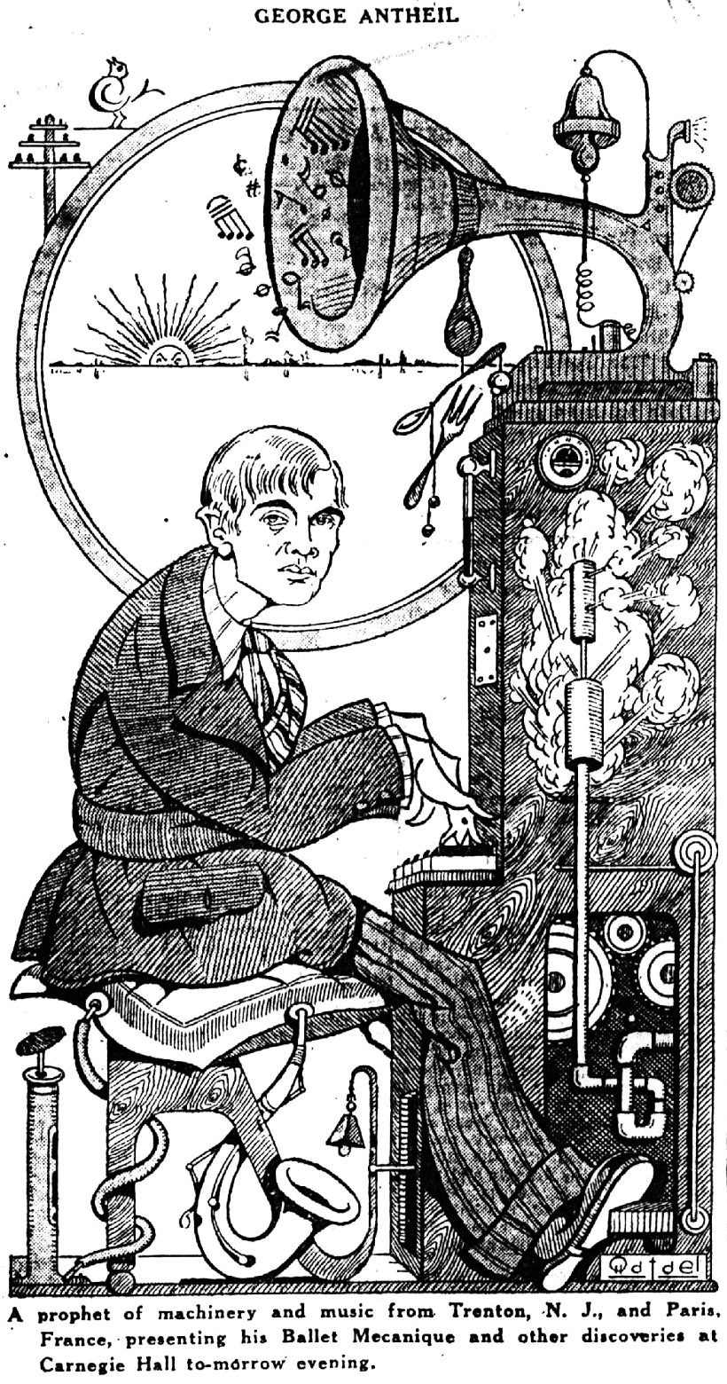 Объявление-шарж: «Пророк механизмов и музыки из Трентона и Парижа представляет свой «Механический балет» и другие открытия в Карнеги-холле завтра вечером»