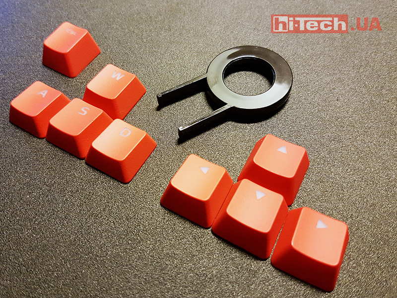Из приятных бонусов — в комплекте с клавиатурой есть капсы красного цвета. Они могут устанавливаться вместо «W», «A», «S», «D», «Esc» и стрелок. Также вы найдете и инструмент-съемник для комфортной замены колпачков.