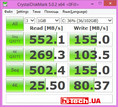 Показатели встроенного накопителя SSD Transcend MSA370 mSATA 128 ГБ в тесте CrystalDiskMark (сжимаемые данные)