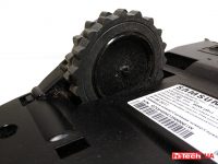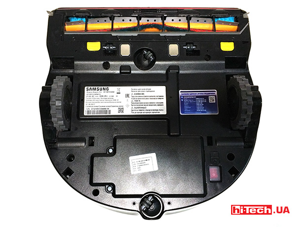 На днище пылесоса расположены та самая широкая щетка, датчики для беспроводной зарядки, основные и вспомогательные колеса. Ведущими являются как раз большие. Они имеют резиновые шины, что хорошо сказывается на сцеплении с покрытием.