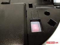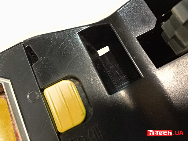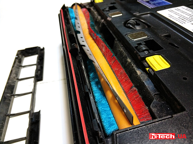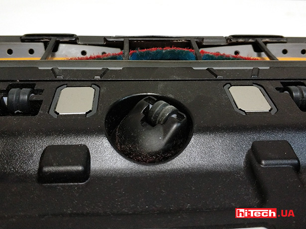 Щетки и забор при желании можно вычистить, оттянув желтые фиксаторы. Еще это может понадобиться, если пылесос «съест» что-нибудь не то. Кнопка питания красного цвета — также внизу, спрятана за прозрачным резиновым уплотнителем.