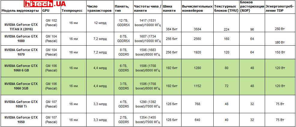 Референсные характеристики видеокарт NVIDIA разных классов последнего поколения, основанных на архитектуре Pascal