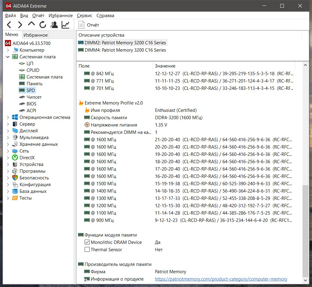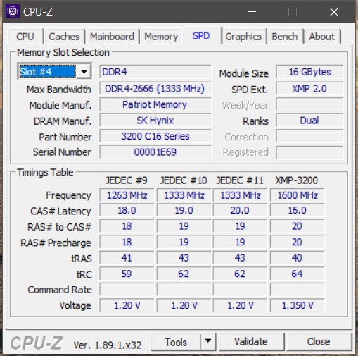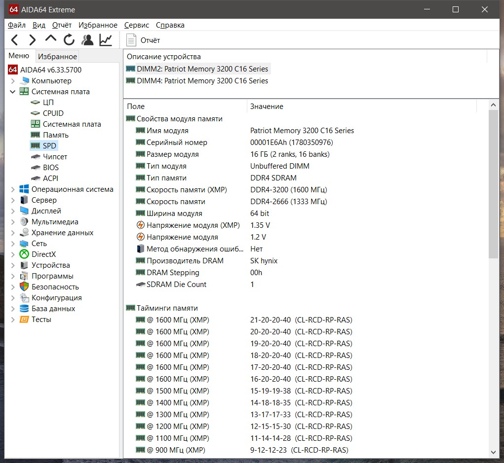 Память использует чипы производства SKhynix. По умолчанию память запускается на частоте 2666 МГц при 1,2 В и таймингами 19-19-19-43. В AIDA64 доступна подробная информация. Используя поддерживаемый профиль XMP 2.0, с которым получаем возможность повышения производительности.