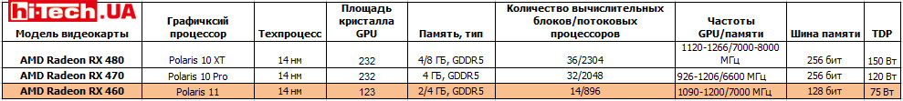Если сравнить характеристики AMD Radeon RX 480/470/460 (см. табл.), то видно, что AMD Radeon RX 480 и RX 470 отличаются между собой не так сильно, а вот RX 460 заметно слабее своих собратьев.