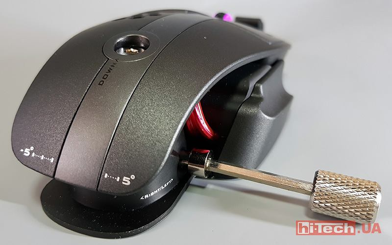 Платформа мыши все также позволяет регулировать высоту площадки под ладонью. А винт сбоку позволяет менять наклон корпуса влево-вправо в пределах 5 градусов. В комплекте для этого традиционно есть шестигранный ключ.