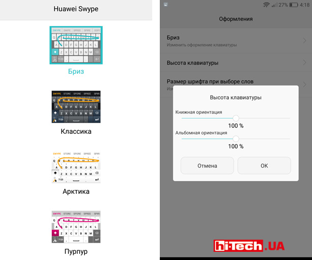 Кстати, фирменная клавиатура оказалась очень продвинутой как функционально, так и по возможностям настройки ее отображения. Очень развит Swype-ввод. Можно не только «печатать» слова, но и Swype-жестами выбирать язык, вызывать цифровую клавиатуру, запускать приложения.