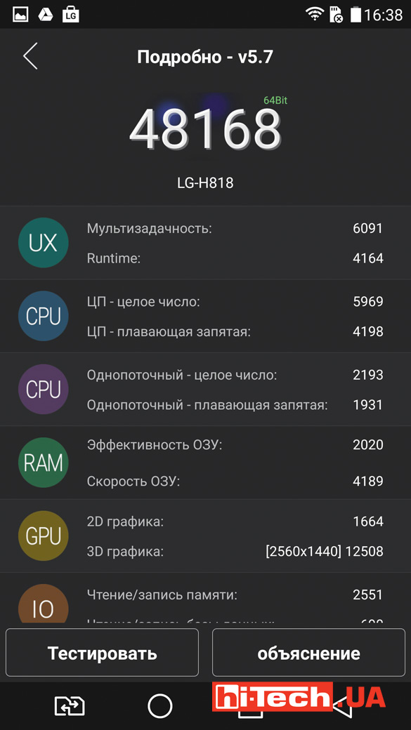 Аппарат построен на базе SoC Qualcomm Snapdragon 808 с шестиядерным процессором, работающим на частоте 1,8 ГГц, и графическим ядром Adreno 418. Это не новый процессор, как можно было бы ожидать, зато претензий к нагреву быть не должно. На практике при высокой нагрузке умеренный нагрев наблюдался в верхней части задней панели смартфона, но на работе аппарата это никак не сказывалось. Работает LG G4 под управлением свежей версии ОС Android 5.1 и, в сочетании с оперативной памятью в 3 ГБ, имеет совсем неплохую производительность.