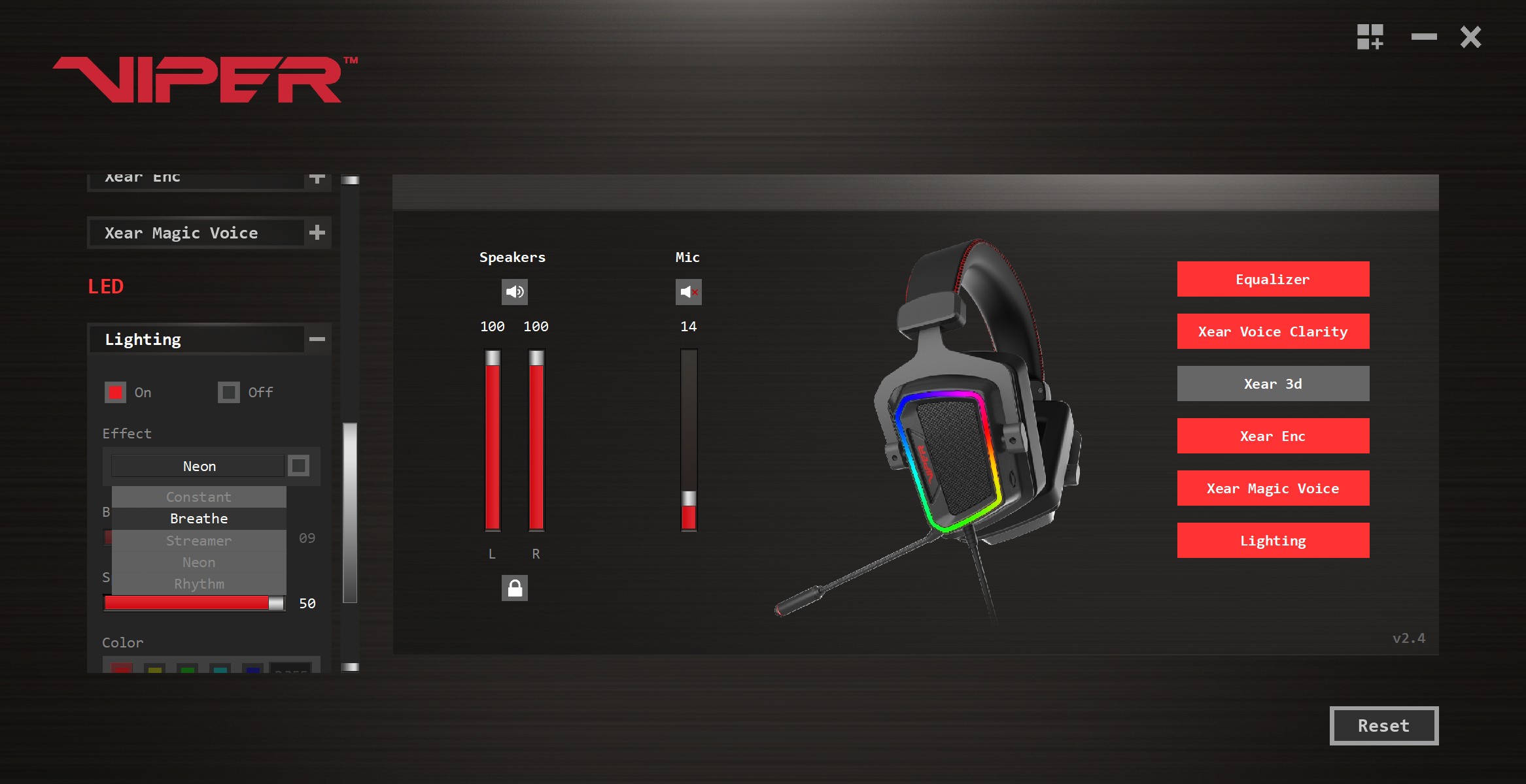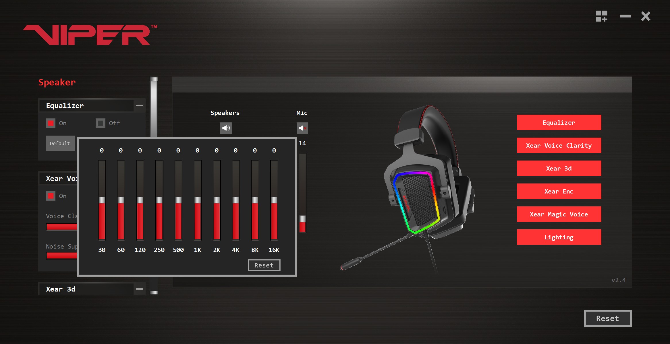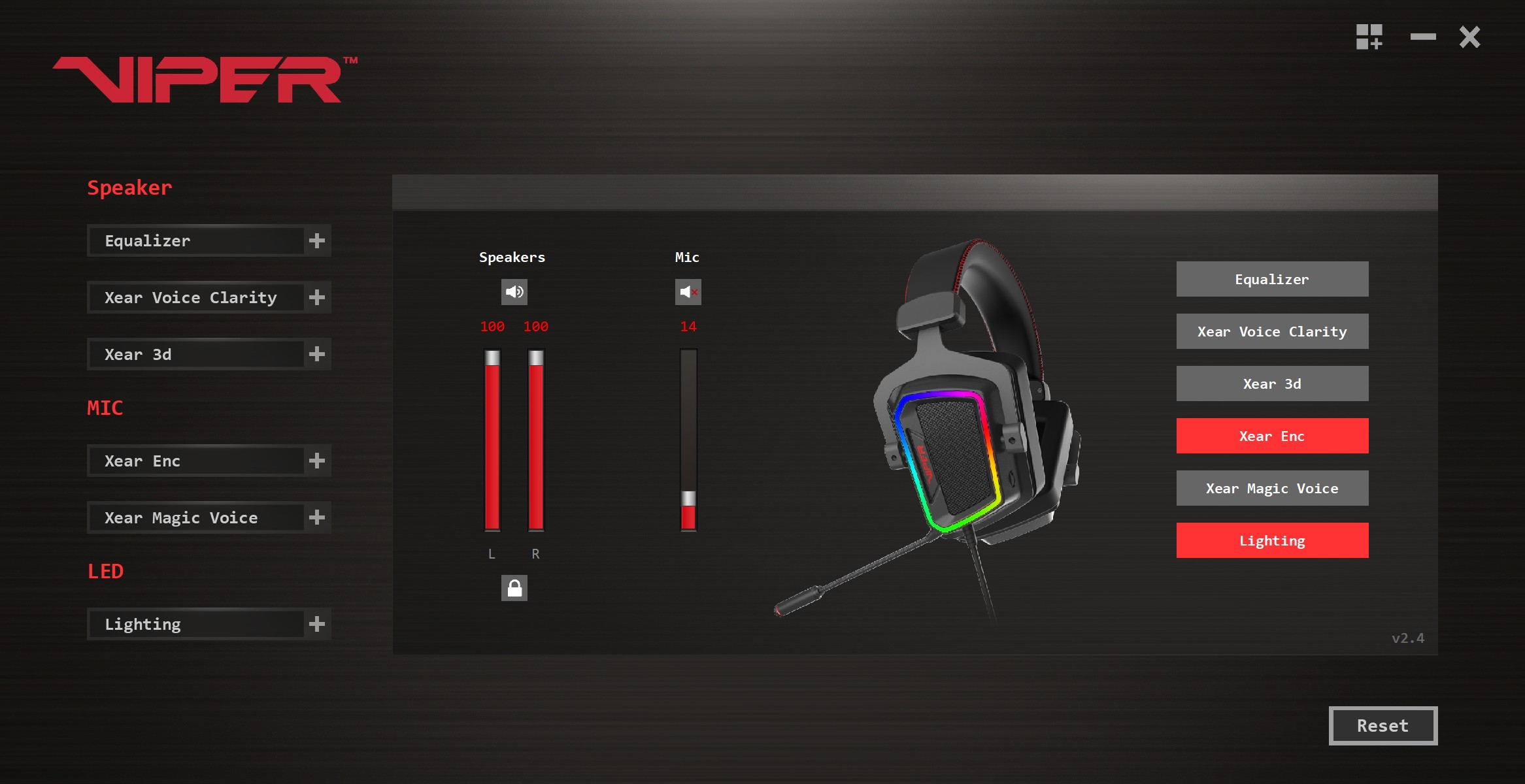 Для более тонкой настройки наушников есть упомянутая фирменная программа Patriot Viper V380, скачать которую, можно с сайта производителя. Здесь, помимо классического эквалайзера и выбора режимов свечения, становятся доступны дополнительные фичи. Так, есть принудительная обработка голоса для повышения качества и четкости звучания, отсеиваются посторонние шумы. Xear 3D — функция, которая отвечает за генерацию среды виртуального объемного звука 7.1. Позиционирование в шутерах с ней работает корректно и помогает точнее определить направление источника звука.