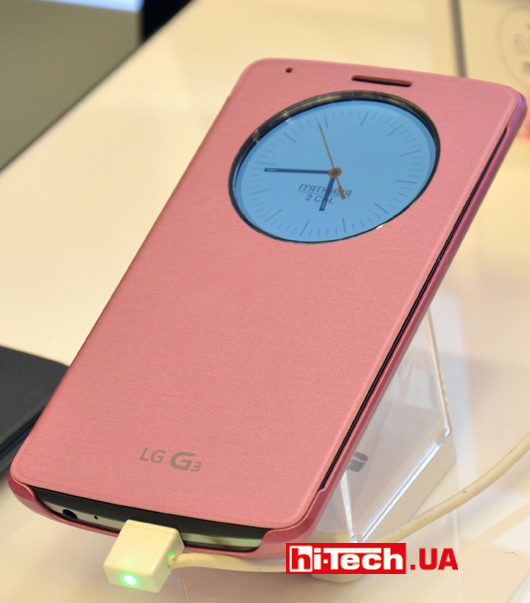 Несмотря на то что на самом деле крышка пластиковая, благодаря специальному покрытию со стороны она кажется металлической, а ее изогнутая формаделает аппарат очень приятным на ощупь, одновременно делает его визуально еще тоньше, чем на самом деле. Нас порадовало, что ни объектив основной камеры, ни клавиши управления совсем не выступают над поверхностью задней панели. Отпечатки пальцев не так заметны, как на глянцевой поверхности предшественника, правда, от царапин никто не застрахован, но на этот случай отдельно можно приобрести защитный чехол QuickCircle. Он выпускается разных цветов и в двух вариантах: с беспроводной зарядкой и без нее. В первом случае чехол устанавливается на место задней крышки, а во втором — поверх нее. Толщина смартфона при этом увеличивается незначительно. Само название чехла подчеркивает новшество: прямоугольное отверстие в нем теперь заменили круглым. Это не только красивее, но и удобнее для управления при закрытом чехле, ведь теперь через круглое окошко стали доступны не только часы с погодой, а и просмотр новых сообщений, количество пройденных шагов, запуск камеры, плеера и осуществление звонков.