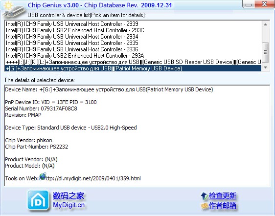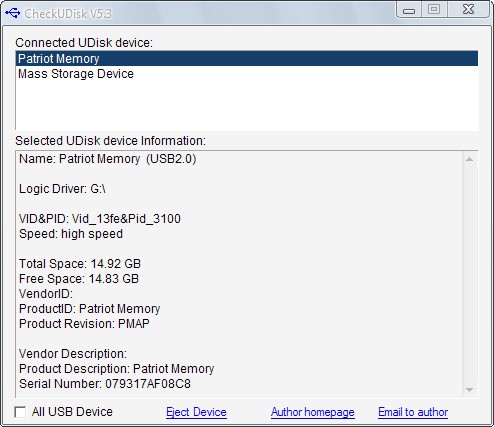Для діагностики внутрішніх характеристик, а саме VID і PID та назву контролера, я використовував утиліти CheckUDisk і ChipGenius. Отримані данні можна використати для пошуку інформації про швидкісні характеристики, а в разі збою флешки і необхідної утиліти для перепрошивки контролера.