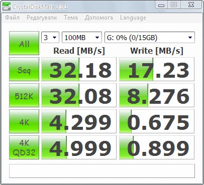 При тестах, коли флешка відформатована в FAT32, де розмір файлу складає 1024Кб, ми бачимо, що виробник навіть применшив швидкісні характеристики накопичувача, бо в тесті читання замість заявлених 30Мб ми бачимо швидкість 32Мб/с, а швидкість запису склада трохи більше 17Мб/с. Чудові результати.
