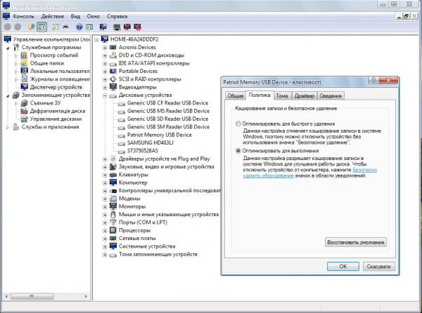 З самого початку флешка відформатована у файлову систему FAT32, але зважаючи на обмеження даної файлової системи, а саме розмір файлу не може перевищувати 4Гб, а об’єм накопичувача цілих 16Гб(реальний 14,9Гб), то доцільніше відформатувати її в NTFS, щоб не витрачати час на розбивання файлів на менші шматки. Якщо у вас стоїть Windows Vista чи 7, то ніяких проблем не повинно виникнути, але якщо у вас ХР, так як і у мене, то потрібно провести деякі маніпуляції. Заходимо в “Диспетчер устройств” і в розділі “Дисковые устройства” знаходимо Patriot Memory USB Device, клацаємо ПКМ і вибираємо “свойства”, а там в розділі “Политика” вибираєм пункт «Оптимизировать для выполнения». Тепер можна форматувати, але після цього бажано повернути налаштування на місце і використовувати безпечне видалення пристрою із роз’єму для убезпечення себе від пошкодження флешки, як говориться – “Береженого Бог береже”.