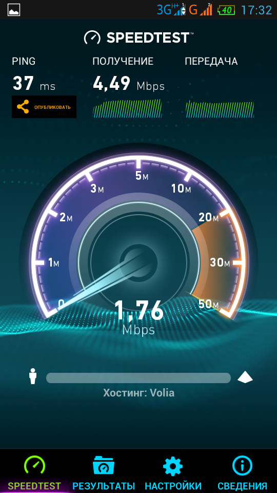 Начну с лайфа. Вот этот результат — потолок на моем HSPA устройстве. Все остальные — не более 2 Мбит. Но это еще отличный результат. Дома — максимум три палки. На улице, что парадоксально — хуже. Лично для меня парадокс объясняется просто — базовая станция life прямо напротив дома.