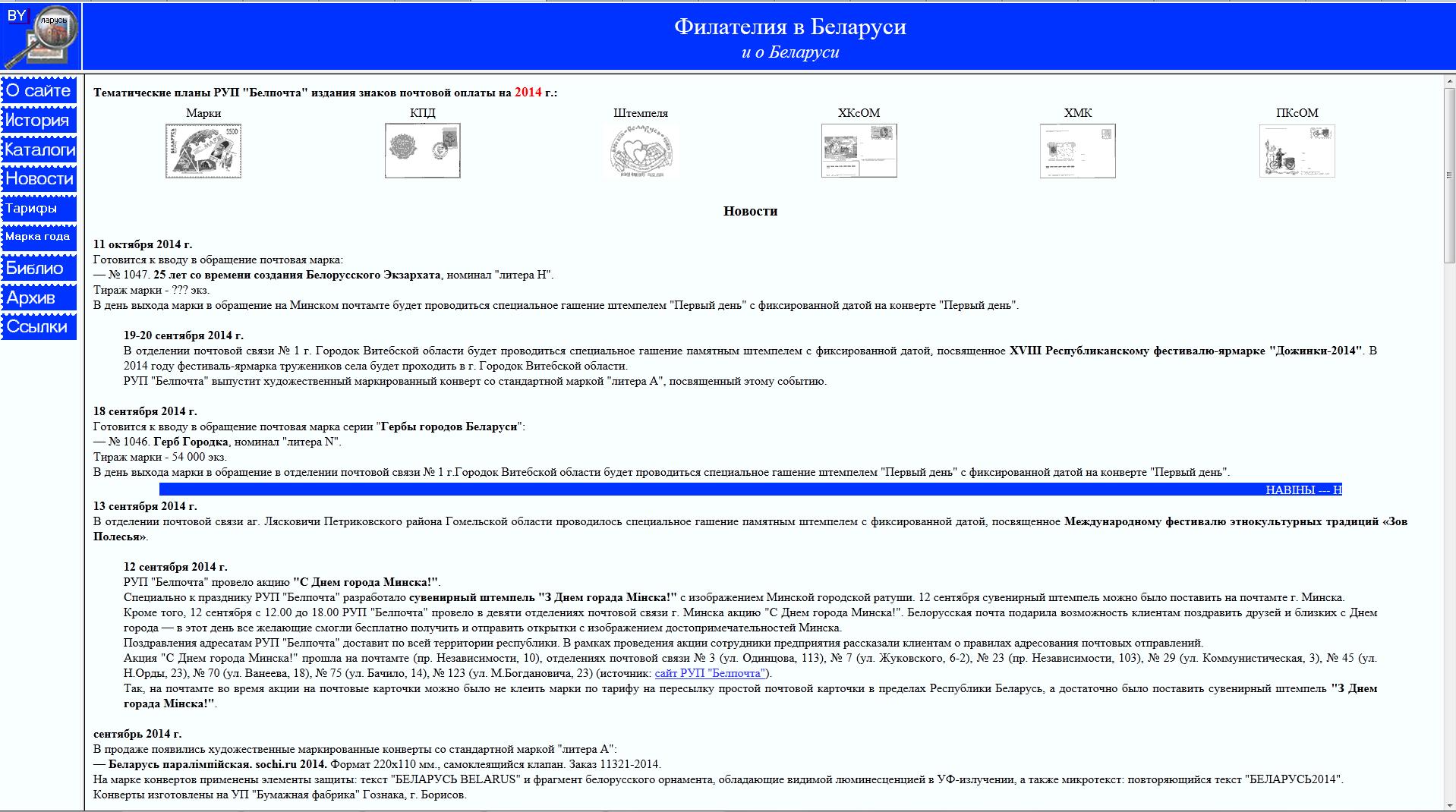 Правда, это уже не официальный ресурс, подддерживаемый Почтой Белоруссии, а инициатива С. Байко, человека увлеченного, создавшего сайт для таких же увлеченных. Выложено очень много хронологических каталогов, рассказано об истории почты и филателии в Белоруссии. Также регулярно отслеживается голосование и выкладываются результаты опроса «Лучшая марка года».