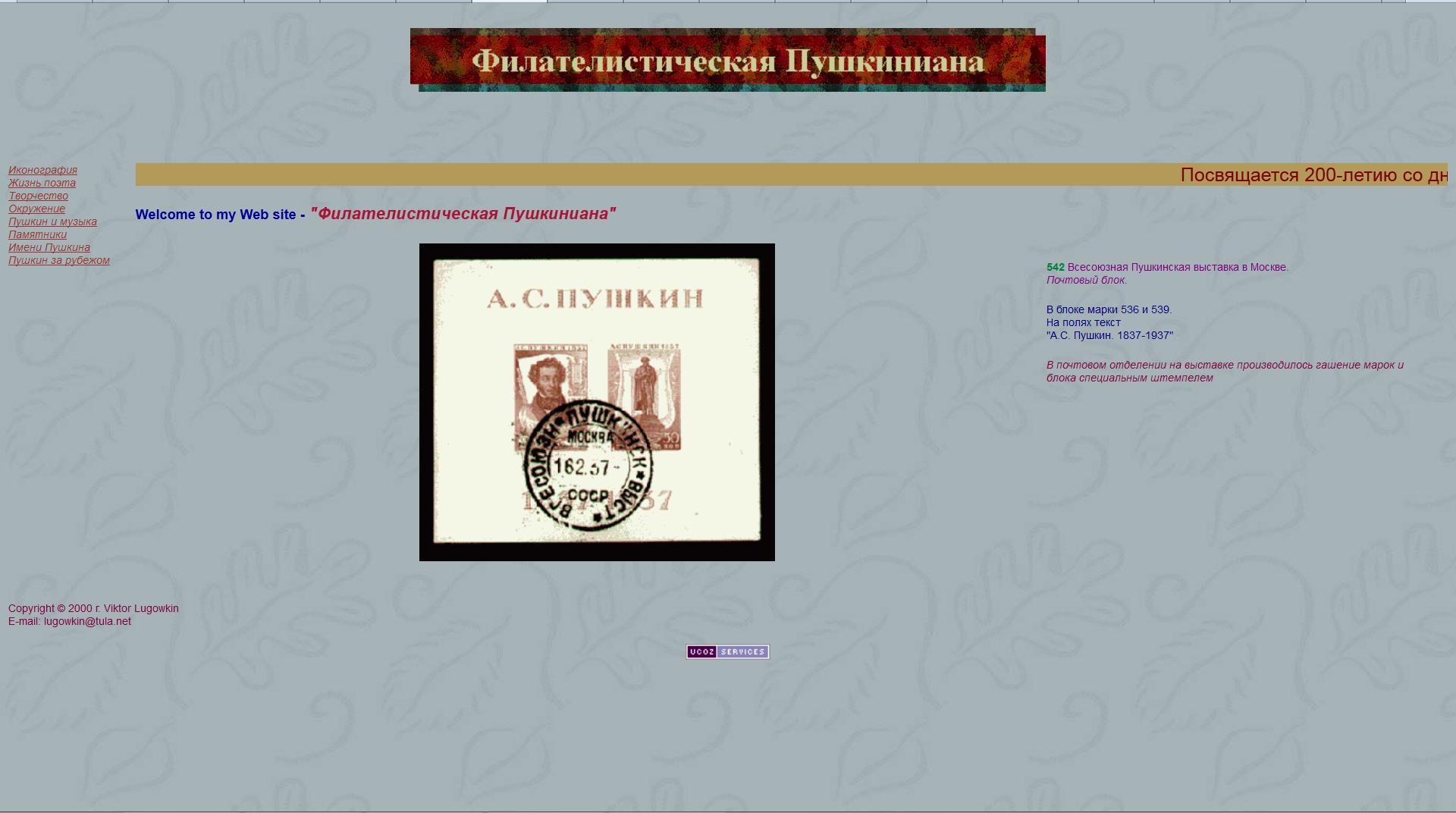 Как нетрудно догадаться из названия ресурса, посвящен он великому русскому поэту Александру Сергеевичу Пушкину, а точнее, увековечиванию самого поэта, его жизни и творчества на почтовых марках и конвертах. Как отмечает создатель сайта, он приурочил его к 200-летию поэта, и, похоже, практически с тех самых пор и не обновлял. Марки рассортированы по рубрикам и подрубрикам, для каждой из них приводится номер по каталогу, собственно изображение и краткий комментарий к нему. Большинство марок из СССР, и буквально 5-6 штук — стран ближнего зарубежья.