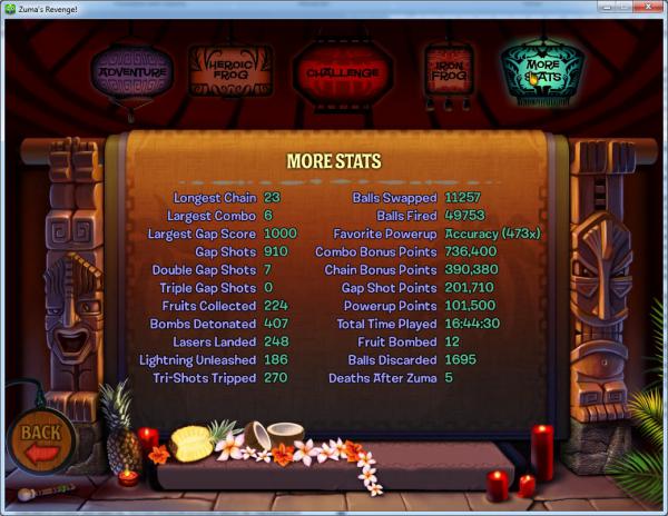 P.S. И напоследок. В главное меню игры добавлен пункт «Tiki Temple», в котором собрана статистика по всем режимам и итоговая статистика. Самый интересный пункт в последней – это общее время, проведенное за игрой. Обратите на него внимание, когда успешно пройдете все режимы игры. И задумайтесь все-таки – а нельзя ли его было потратить на что-то более полезное? 😉