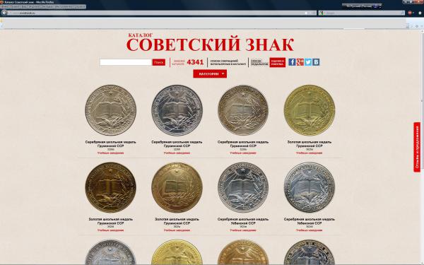 Сайт посвящен памятным медалям, вымпелам и отличительным знакам времен Советского Союза. На момент посещения его каталог насчитывал свыше 4300 экземпляров, отсортированных по категориям.