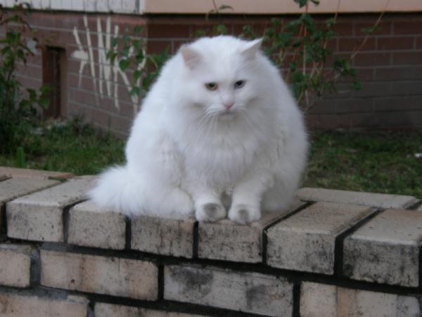 Котяра дуже шикарний, такий поважний, сидить пишається своєю персоною. Він навіть не звиртає жодної уваги на людий, які проходять поруч і зупиняються помилуватися, лише зниважливо поглядає на собак.