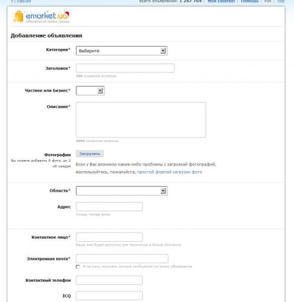 Все надзвичайно просто і абсолютно безкоштовно. Зайшовши на необхідний сайт, знаходимо значок – “Подать объявление”. Потім пройти процедуру реєстрації, вказавши свої данні (іноді лише електронну пошту, ім’я, але може бути і більше). Вибираємо розділ де хочемо розмістити оголошення, вказуємо назву оголошення (наприклад: продам BMW 1000RR, до речі найшвидший мотоцикл), розписуємо технічні характеристики та інші особливості. Для кращого сприйняття, бажано додати фото, а ще краще і відео. Вказуємо ціну, або бажання обміну. А на emarket.ua можливо також роздрукувати ваше оголошення, якщо ви хочете його десь розклеїти.