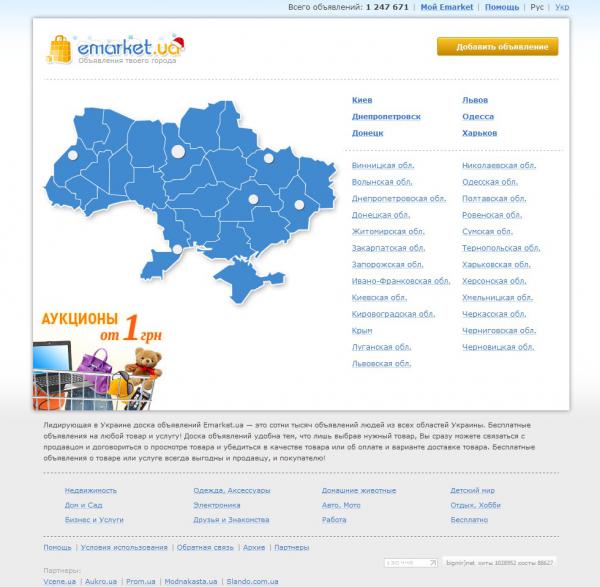 В свій час, я познайомився із сайтом emarket.ua, на якому зараз більше мільйона оголошень з усіх куточків нашої країни. Вибравши регіон і потрібну вам категорію (транспорт, побутова електроніка, товари для дому та інші) і потрібно під категорію (мотоцикли, ПК, мобільні телефони та інші) можна почати пошук привабливого оголошення. Присутня тут можливість сортування як за датою подачі оголошення, так і за наростанням чи спаданням ціни. Також можна, в лівому верхньому куті, задати назву товару і натиснувши знайти, отримати результати пошуку. Знайти можна, майже, все від товарів і послуг, до нової роботи.