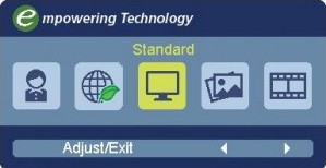 Вибравши клавішу “е” ми потрапляємо в підменю де можна вибрати готові профілі роботи монітору, типу: стандартний, кіно, зображення, еco, або режим користувача де збережені самостійно задані параметри користувача.
