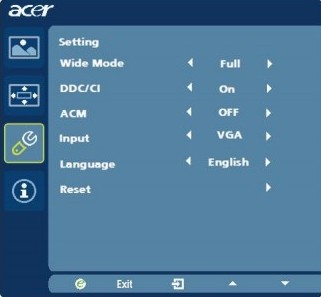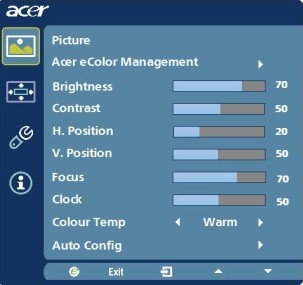 Загалом в моніторі присутні всі важелі, для тонкої калібровки, що має сподобатись досвідченим користувачам. А для більшої зручності, на диску можна знайти програму Acer eDisplay Management, яка дублює пункти меню.