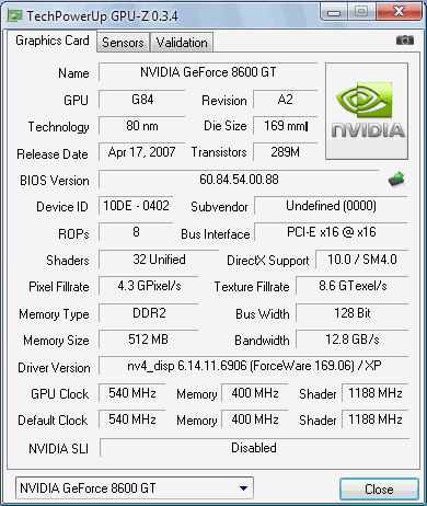 Утиліта GPU –Z підтвердила усі характиристики 8600GT, а саме що перед нами відеокарта на основі 80нм чіпа — G84, який має у своєму складі 32 уніфікованих шейдерних процесори і 8 блоків растрових операцій(ROP). Обмін данних між чіпом і пам’яттю здійснюється по 128 бітній шині. Частотні характеристики чіпа/шейдерного домену/ відеопам’яті складають 540/1188/400Мгц відповідно.
