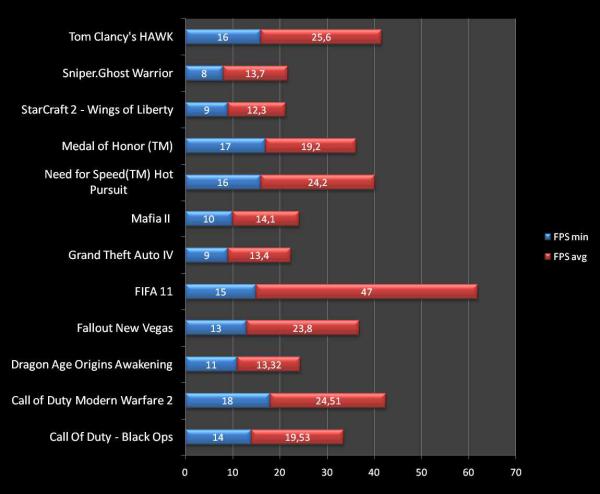 Всі тести проводились у середовищі Windows XP. Замір FPS( кількість кадрів за секунду) здійснювався вбудованим бенчмарком, а при його відсутності використовувалась утиліта Fraps. Ігри запускались при роздільній здатності 1280х1024 з високою деталізацією, зглажування вимикалось, анізотропна фільтрації 16х.