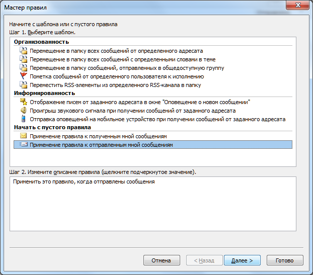 Шаг 3. В открывшемся окне Мастер правил в группе Начать с пустого правила выбираем пункт Применить правило к отправленным мной сообщениям. Нажимаем кнопку Далее. В окне мастера правил будет предложено выбрать условия отбора