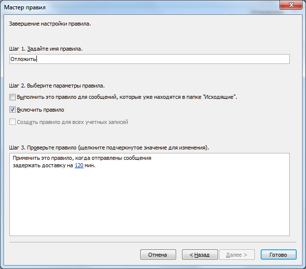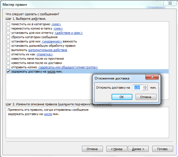 Шаг 5. В окне выбора действия включаем флажок Задержать доставку… и в области изменения описания правила вводим длительность задержки щелчком на подчеркнутом тексте. Снова щелкаем на кнопке Далее. Обратите внимание, что отправление может быть задержано на срок до 120 минут.