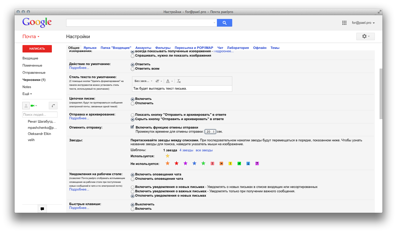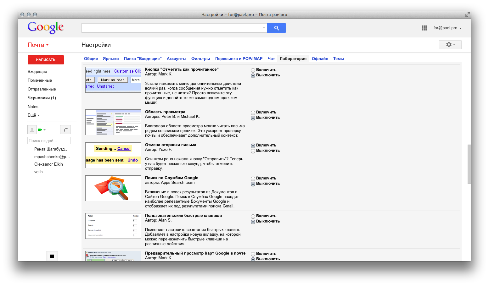 4. Включите в списке экспериментальных функций возможность «Отмена отправки письма», сохраните изменения.
