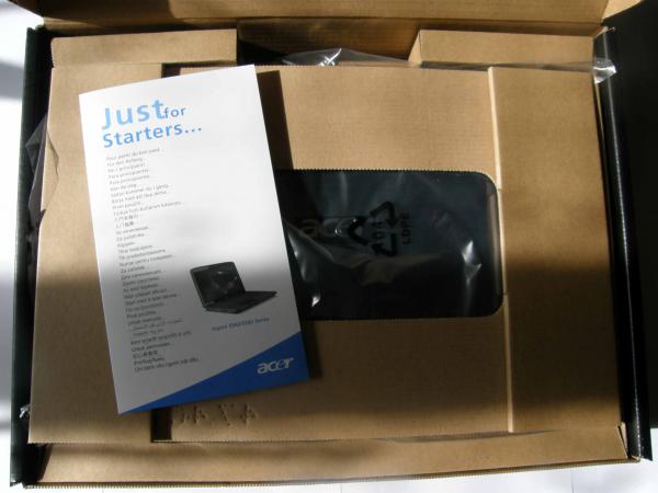 Розкривши упаковку бачимо вкладиш з інструкцією по швидкому старту роботи з ноутбуком .Сам ноутбук накритий картонкою з прорізом, в поліетиленовій упаковці знаходиться нижче.