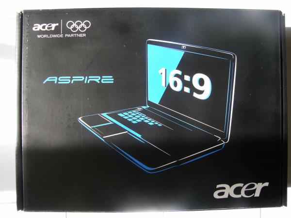 Навіть глянувши на упаковку, можна сказати, що перед нами не дешевий ноутбук, а серйозний лептоп. Упаковка виконана у чорних тонах, бюджетні моделі мають упаковку з сірого картону, в лівому верхньому куті зазначається, що Acer є офіційним спонсором олімпійських ігор, нижче красується напис Aspire, по центру монохромне зображення ноутбука. Для переносу передбачена пластикова ручка, що стане в нагоді при транспортуванні. На бічній стінці упаковки міститься наліпка з основними характеристиками і країною виробником – Китай.