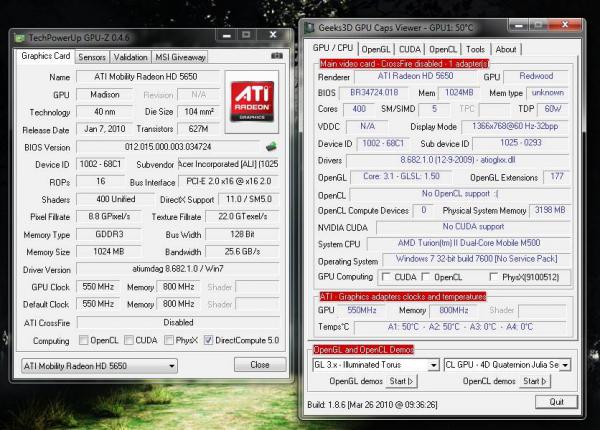 Частота GPU сладає 500МГц, а пам’ять стандарту GDDR3 і об’ємом 1Гб(чесно кажучи зайвий такий об’єм, ніде його задіяти) працює на частоті 800МГц(ефектина частота 1600), обмін інформацією між пам’яттю і графічним ядром здійснюється по 128 бітній шині. Ця дискретна відеокарта є представником самої останньої серії, що має підтримку API DirectX 11 і шейдерів п’ятого покоління. Всі характеристики вселяють надію, що в іграх ми отримаємо високий FPS.