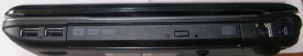 А з правого боку ми маємо: два розйома USB 2.0, DVD Super Multi, порт модема (RJ11), замок типу Kensington для попередження крадіжки.