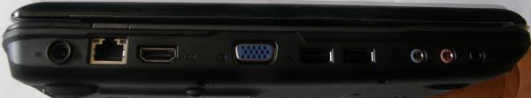 Зовнішній вигляд сподобається багатьом. З лівого боку розміщено: роз’їм для підключення блоку живлення, розйом Fast Ethernet (RJ45), порт HDMI, розйом зовнішнього дисплею(VGA), два порти USB 2.0, гнізда для підключення мікрофону і навушників.