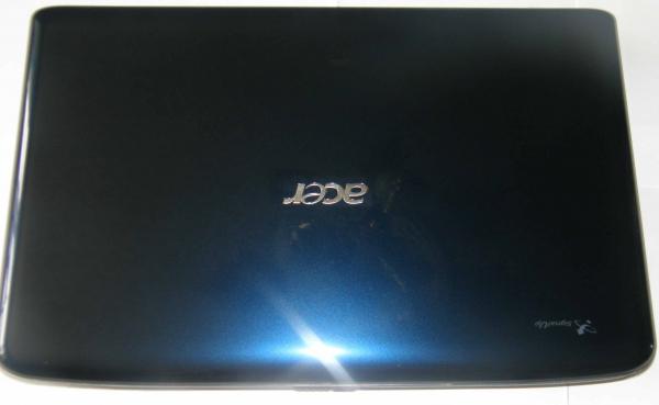 Ноутбук має випуклу форму, крижка глянцева, синього кольору. Має розміри383(Ш) х 250(Г)х26/37(В)мм і вагу 2,8кг відповідно. По середині кришки красується сріблястий напис — Acer.