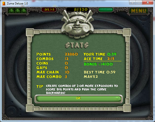 Заполняется она по мере набора игроком очков. Очки в игре даются практически за все. Уничтожили цепочку шариков – получите очки за каждый шар в ней. Цепочка оказалась очень длинной – получите бонус. Совершили несколько «комбо» подряд – получите еще очки. Взяли бонусный шарик – и снова очки падают на ваш счет. Кроме того, периодически на уровнях в произвольных местах возникают вращающиеся монетки, сбив которую, вы вновь-таки заработаете дополнительные очки. Также заработать баллы можно, уничтожая шарики через разрывы в движущейся цепочке (так называемые «gaps»).
