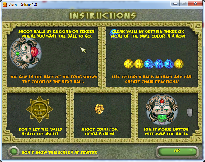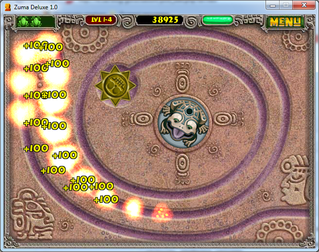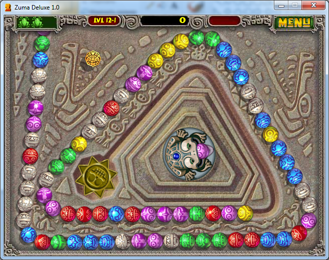 Чтобы победить, необходимо пройти 12 пещер-эпизодов, в каждой из которых вас ждет определенное количество уровней (чем дальше – тем больше). На каждом из них требуется не пропустить длинную цепочку из разноцветных шариков, генерируемую враждебным божеством, к золотому черепу. Для этого и пригодится умение лягушки стрелять разноцветными шариками. Ведь если после выстрела и попадания шарика в цепочку образуется группа из не менее чем трех шариков одного цвета, то она полностью исчезает. Более того, если слева и справа от уничтоженных шаров будут располагаться шарики одного цвета, то они соединяются (при этом вся цепочка слегка откатывается назад). А если их опять окажется не менее трех, то они снова исчезнут (получается так называемый «комбо»-прием), и так далее.
