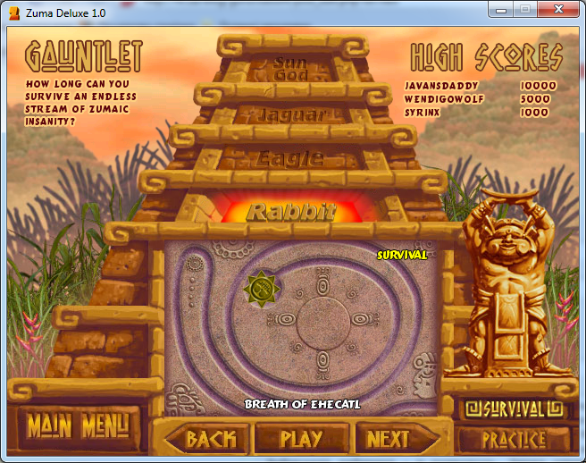 Если же данный путь не для вас, то есть и второй вариант. В игре предусмотрен второй игровой режим – “Gauntlet”. Это ни что иное, как игра на выживание. В этом режиме цепочка шариков бесконечная. Здесь нет права на ошибку, нет запасных попыток – ошибиться можно только один раз. Выбираете лабиринт – и понеслось. Через определенные моменты времени, по достижении заданного количества набранных очков, происходит усложнение игры – ускоряется движение цепочки, добавляются новые цвета шариков. Так что это – режим для настоящих профессионалов.