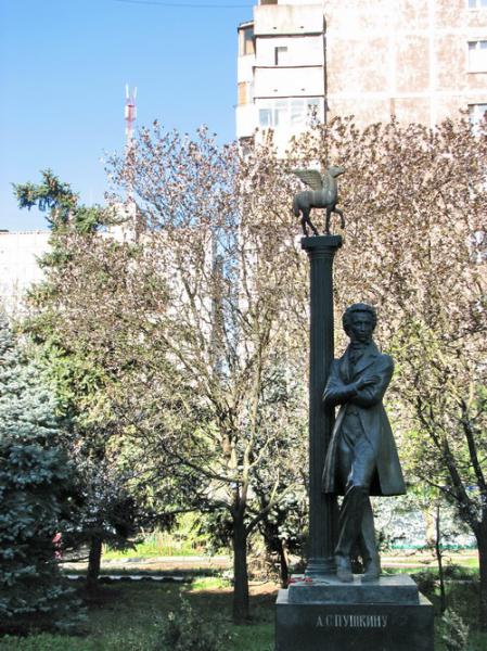 Памятник Пушкину возле городской библиотеки (на заднем плане — мачта с антеннами сотовой связи и LTE)