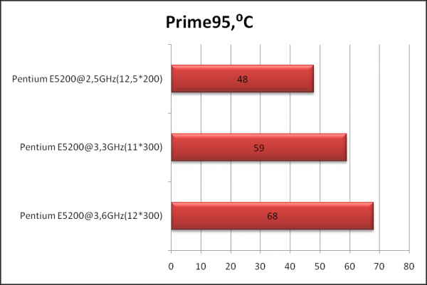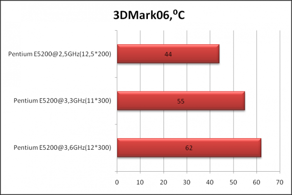 3DMark06 зміг прогріти процесор до 62°С. Температура нормальна для довгого життя процесора навіть на частоті 3,6 ГГц.