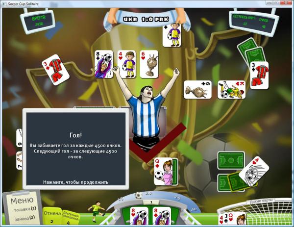 В футболе, чтобы победить, нужно забивать голы — без этого, увы, никак. В футбольном пасьянсе для этого нужно набирать очки. Каждые набранные 4500 очков автоматически приводят к голу в ворота команды соперников.