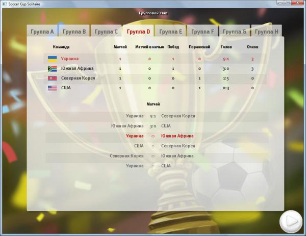 Как почти очевидным образом следует из названия, разложение пасьянса совмещено с игрой в футбол. Цель простая — необходимо сборную выбранной страны привести к победе на чемпионате мира по футболу. Все, что для этого нужно — это пройти групповой турнир из трех матчей, а потом победить в матчах плей-офф (одна восьмая финала, четвертьфинал, полуфинал и финал).